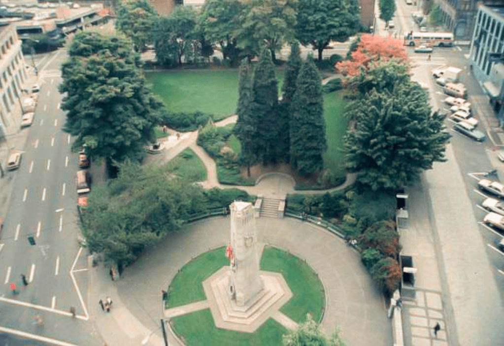 The geography of the park all angles down to the giant cenotaph, the stone helmets sitting on top of the lights arcing around it are understated but beautiful, and the heritage buildings that surround the block — including the Dominion Building, once Vancouver’s tallest structure — give an appropriate sense of grandeur and historical ambiance to the square.