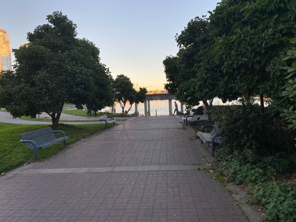 The seawall-long cycling/walking path divides the field from the water, while the trees surrounding the sports courts provide some cover and give a little bit of breathing room from the condos.