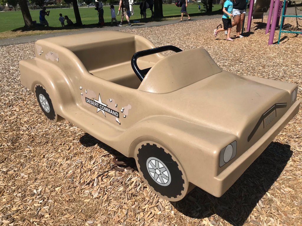 (There’s also, right in the middle of it, a very strange springy swing with a “Desert Command” army car theme, for reasons that still confuse me, but let’s move on.)