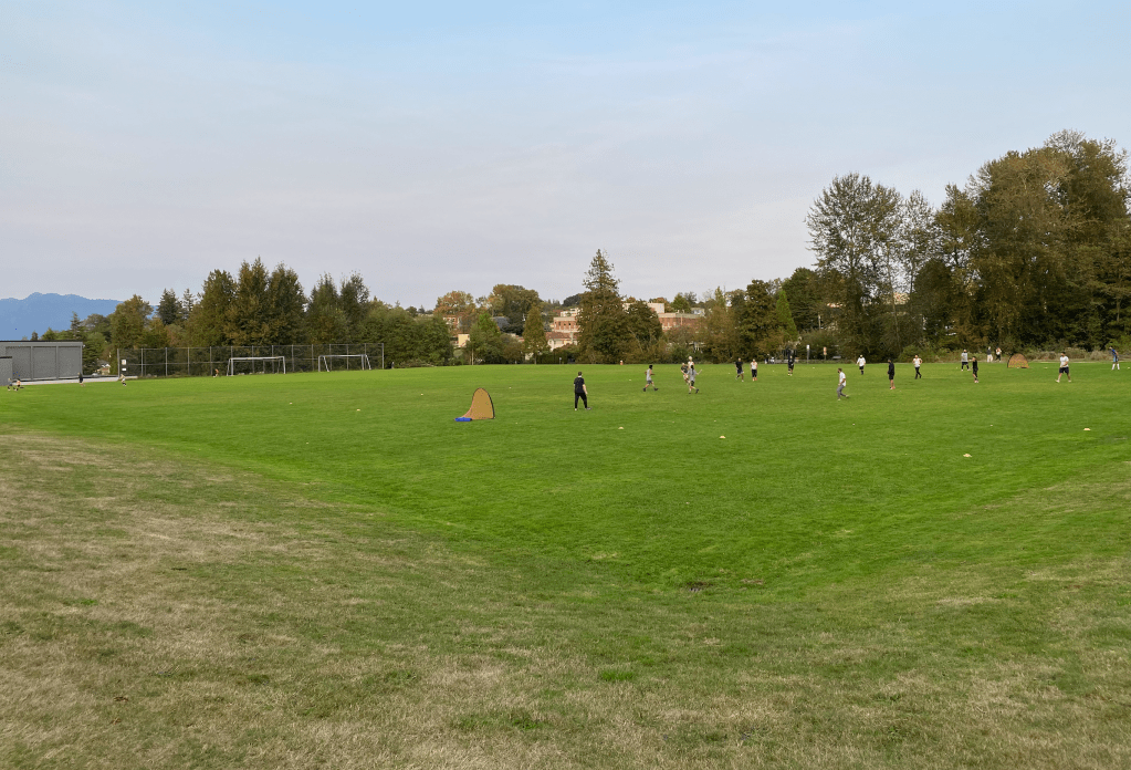 There are 35 parks in the City of Vancouver with a washroom and a big field you can play soccer or baseball on.