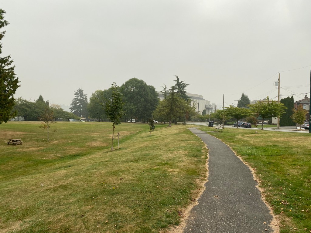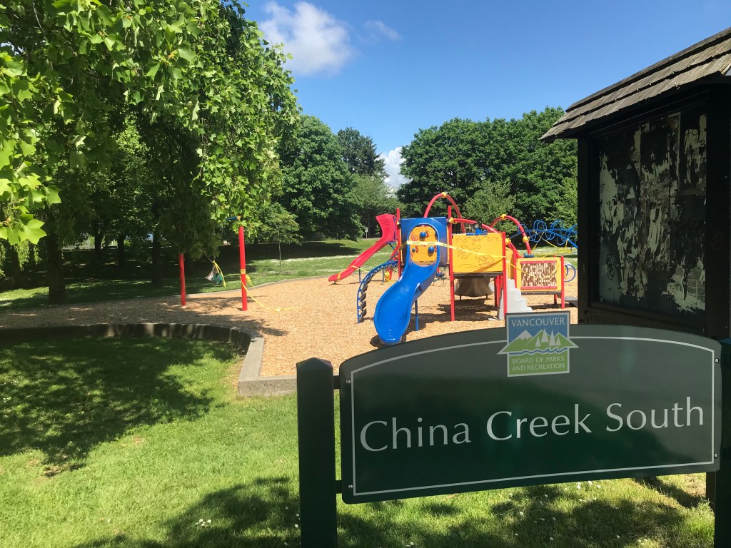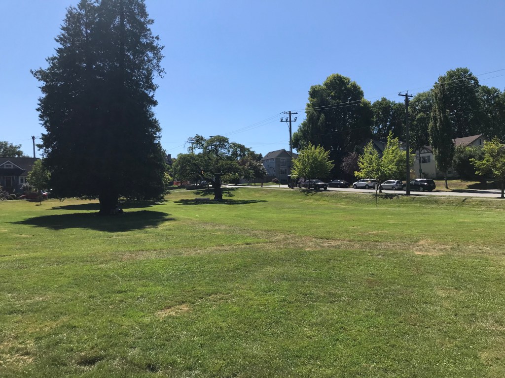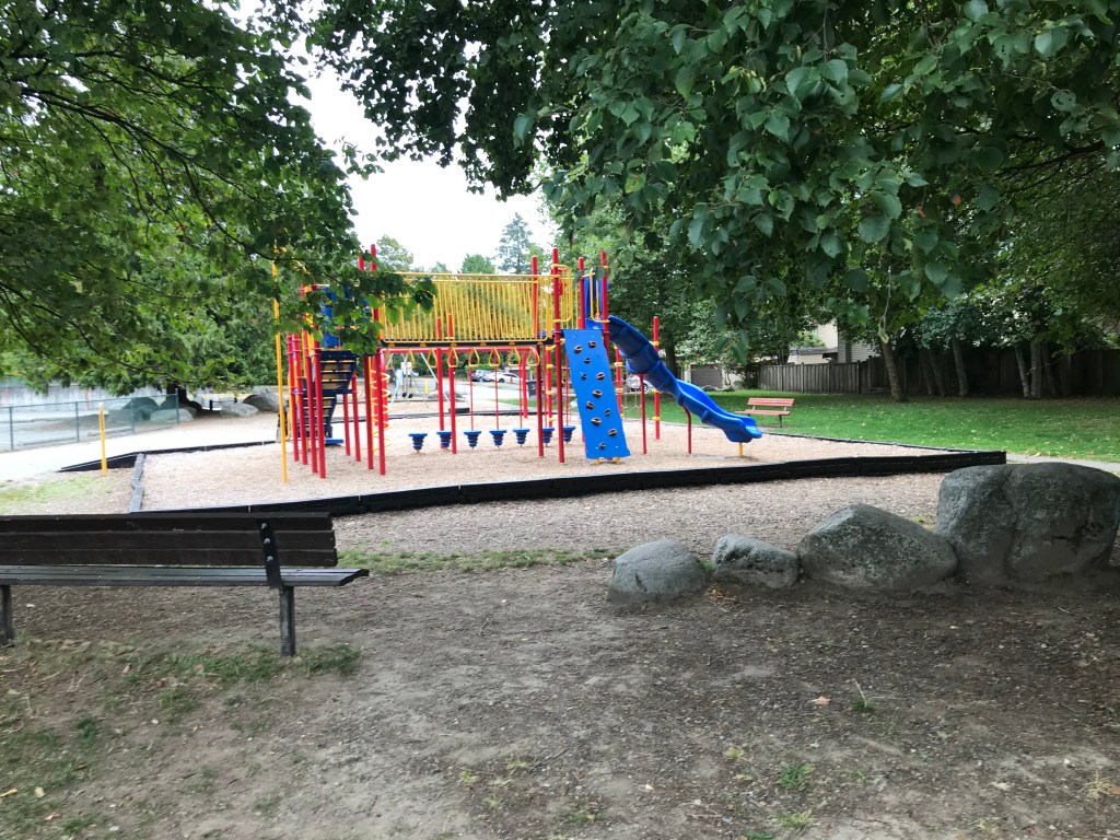 The playground has a lot going for it though: a large sandy area with multiple slides, separate play structures for different ages, and a zip line. And the park is right next to the street, but the classic Vancouver motif of large trees overhanging a quiet neighbourhood street gives extra character and serenity to the area. The field is dotted by a number of tall trees, ideal for quiet contemplation or hide and seek, giving it a feel far from the big city.
