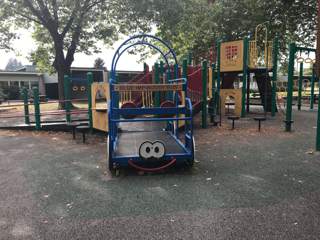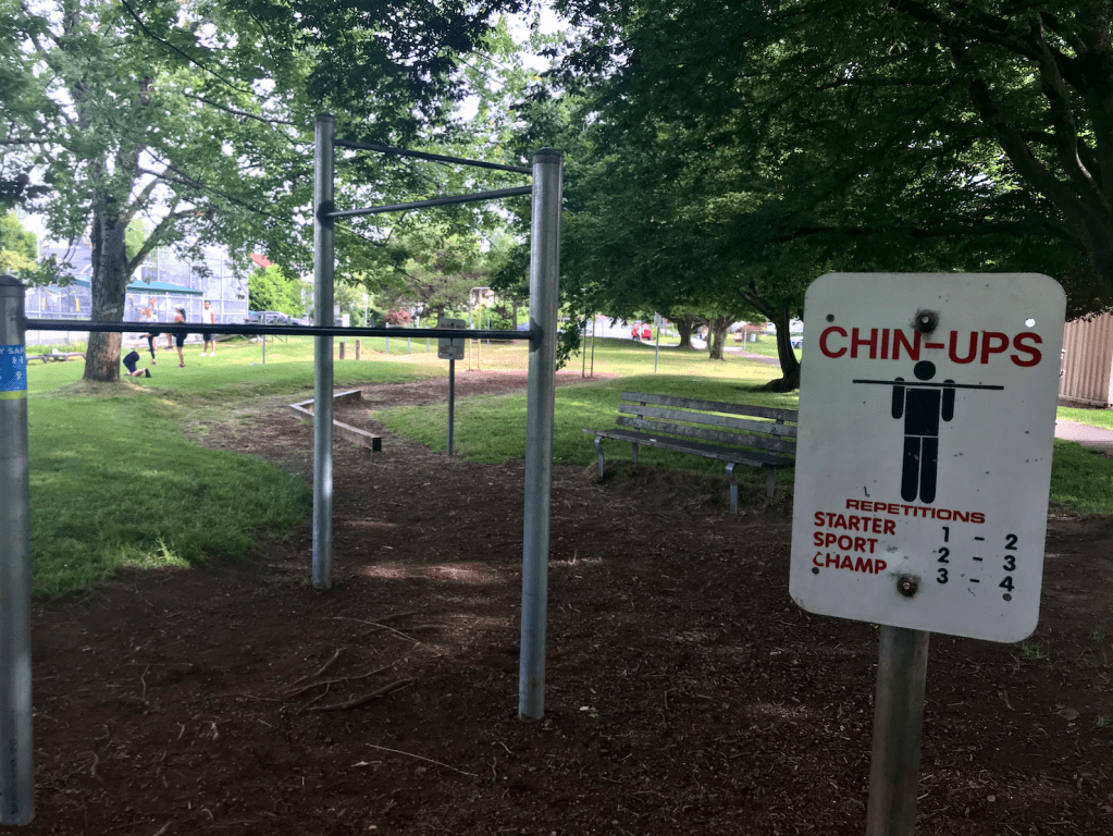 One is the weird old-timey fitness course, a collection of equipment that looks like it hasn’t been upgraded in decades, but seems usable for basic chin-ups or whatever it is one does on a balancing beam. Another is a pair of excellent play structures between the fields and the school, one with rubber turf and ramps and plenty of climbing equipment for all ages. And the baseball fields are popular, with just the right amount of space in between each of them.