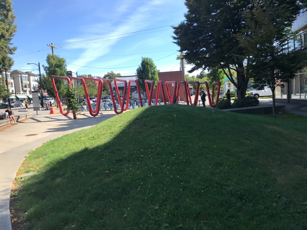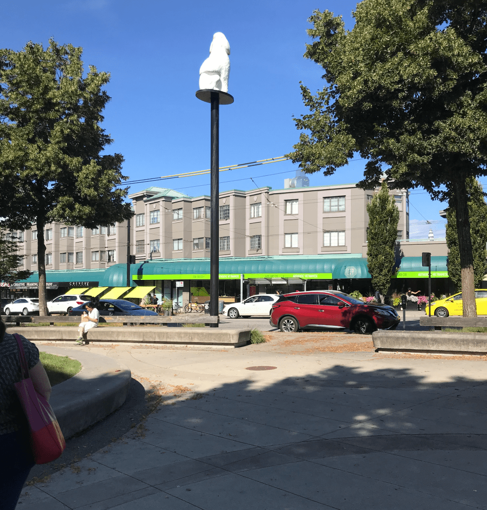 The “seating” is a few small and rickety tables, with small metallic chairs chained to the table in a completely uninviting manner. In the middle, there’s a mound of grass that’s too steep for people to actually picnic on. The rest of the park is a strip of concrete, with the somewhat infamous Main Street Poodle statue standing guard over everything.