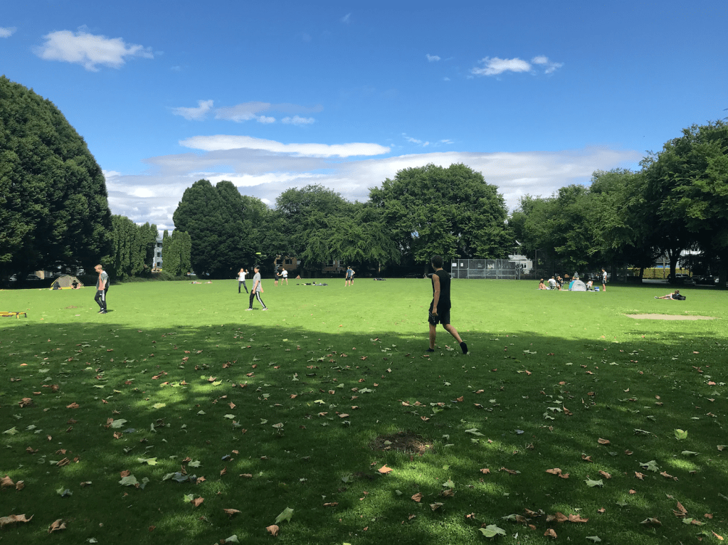 But as a park, it’s nice, though lacking in any real flow, owing mostly to the street that bisects that two parts. One side has tennis courts, washrooms and a playground; the tennis courts taking up 20% too much space to make it an interesting walk. The other side has an all-purpose field for soccer and baseball, with lush grass and tall trees blocking some of the noise from 4th.