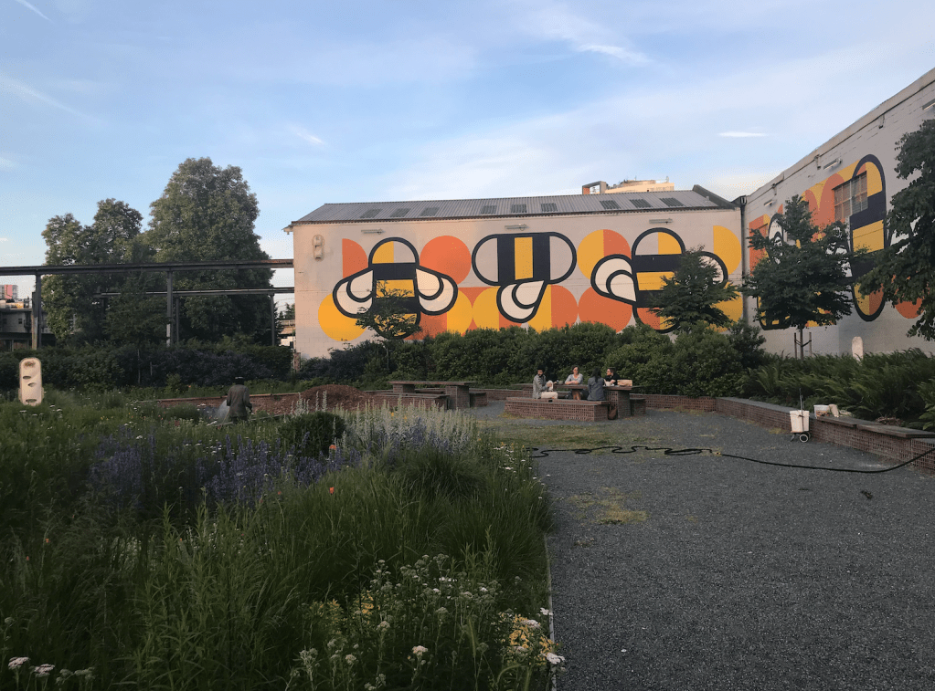 This is the more simple of the two, but it’s still a perfectly pleasant place to hang out, with a number of large benches to sit on. Surrounding them is the well-developed theme of a “pollinator park”, with plenty of flowers, plants and murals that promote healthy bee-living.