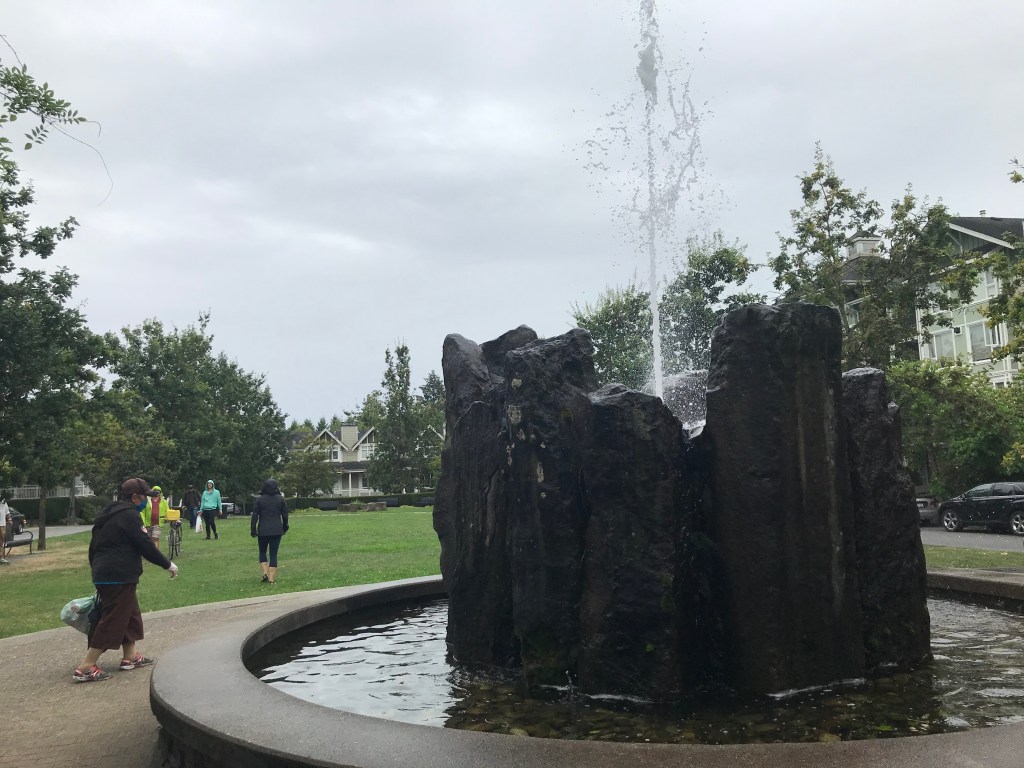 In the middle of a large townhome development just to the east of the Champlain Square Shopping Centre is a small street called Mont Royal Square. It makes a loop and in the middle there’s a long thin lawn, with some benches and rock art at one end.