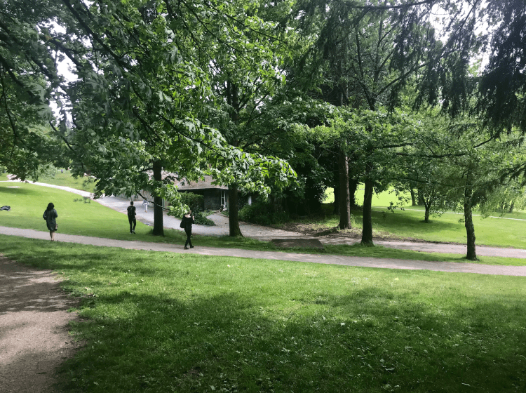 There’s the requisite field space in the middle of the park, but it’s very lush grass, and it’s surrounded by a gentle slope on the north and east that provide very nice views. Along that gentle slope are washrooms, a skatepark, an off-leash dog park, and a hidden disc golf course among the trees — none of which are amazing, but all of which do a very good job. And the Arbutus Greenway on one side and large trees on the other makes the park feel fairly removed, even if it is close to two relatively busy streets.