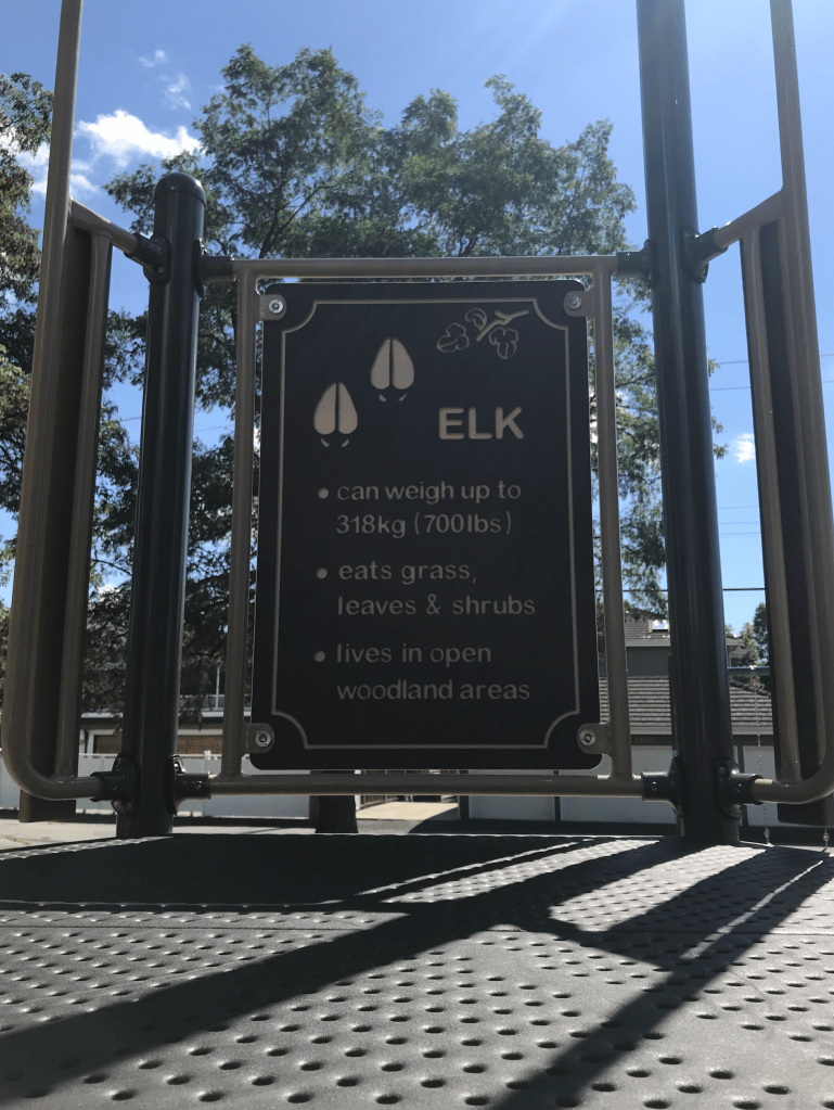 And it’s a pretty good park! Even if you were to place it off a generic street, there’s a tennis court, a basketball court, just enough grass for a barbeque, and a small but 6/10 playground, with a couple slides, swings, and most importantly (and I am not making this up) multiple educational displays about elks.