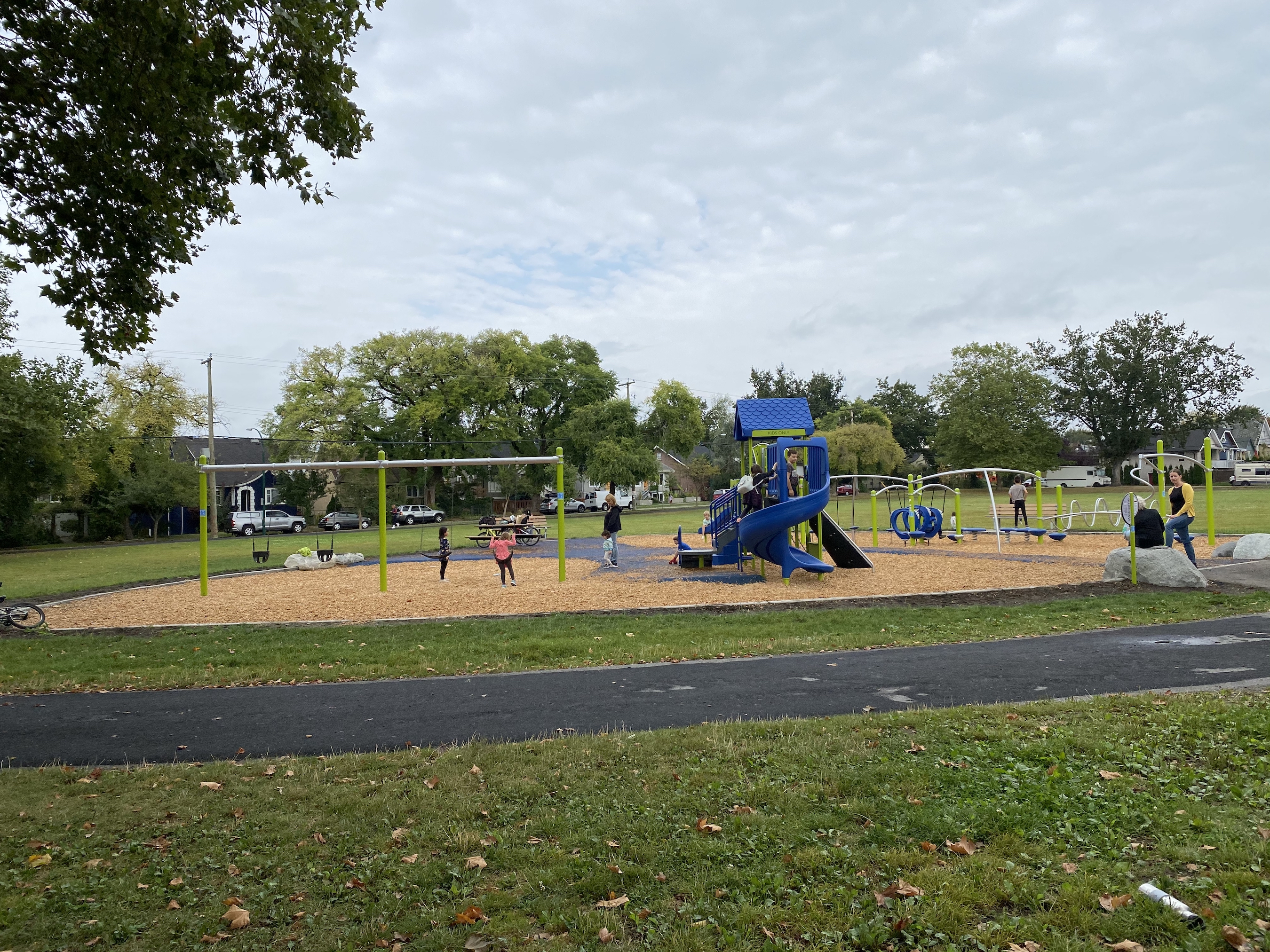 And the very new playground is quite good: woodchips and rubber on the ground, a number of different slides and things for small children to worm their way through.